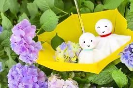En juin, le Japon entre dans la saison de pluies. C'est un charme traditionnel japonais dans lequel les gens accrochent ce Teru-Teru-Bôzu près d'une fenêtre ou sous les avant-toit pour éviter la pluies et pour prier un ciel bleu. Pendant cette saison des pluies , les fleurs d'hortensia fleurissent partout.